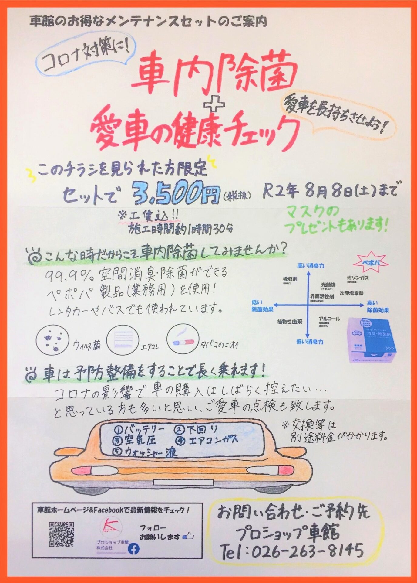 さて、車館では来月8/8(土)までお得なメンテナンスセットをご案内中です!