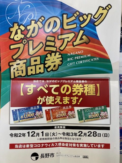 さて、プロショップ車館は「ながのビッグプレミアム商品券」の取扱登録店となっております!