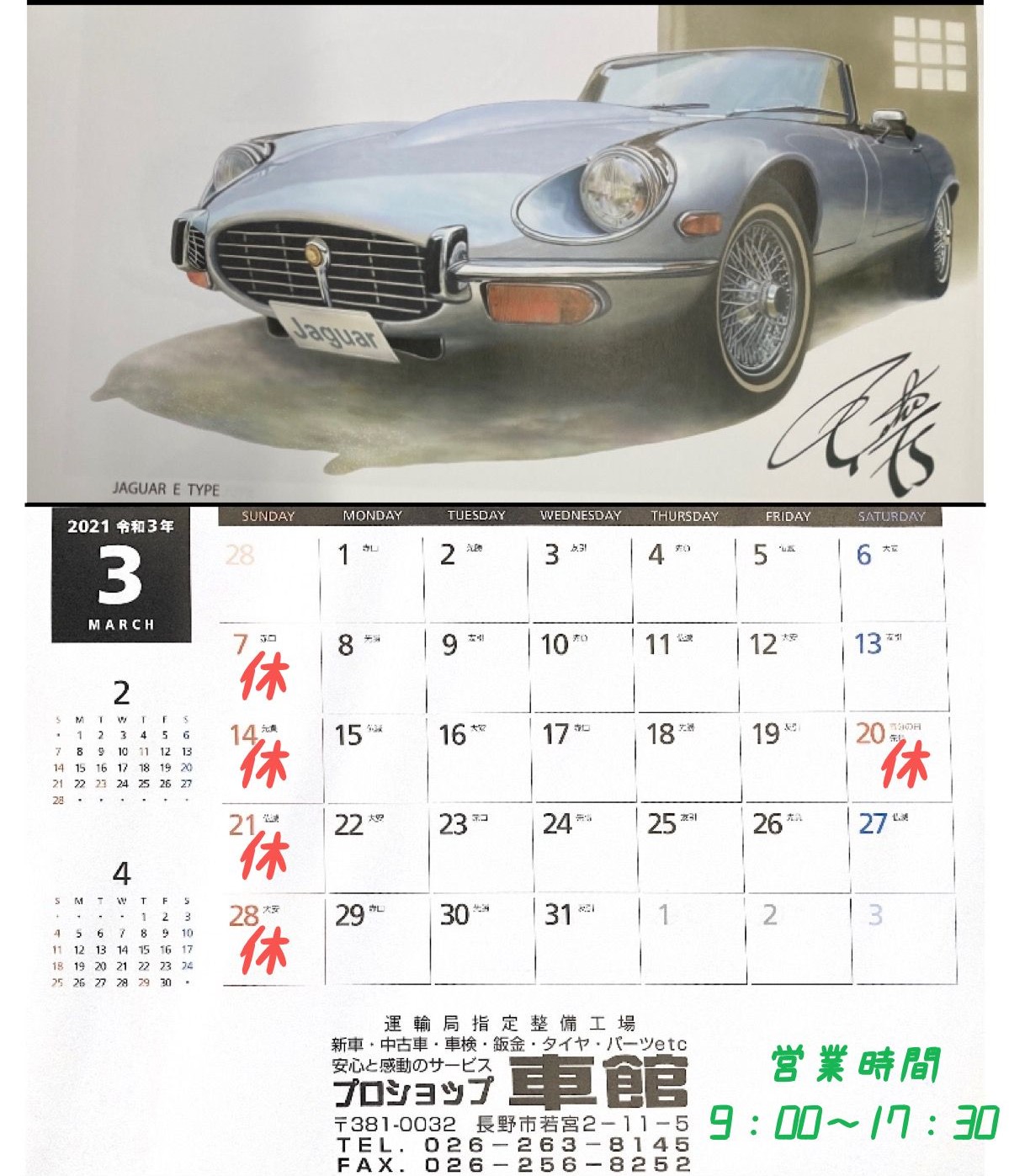 3月は車検台数が多い月ですので、車検をむかえられる方はお早めにご予約ください。