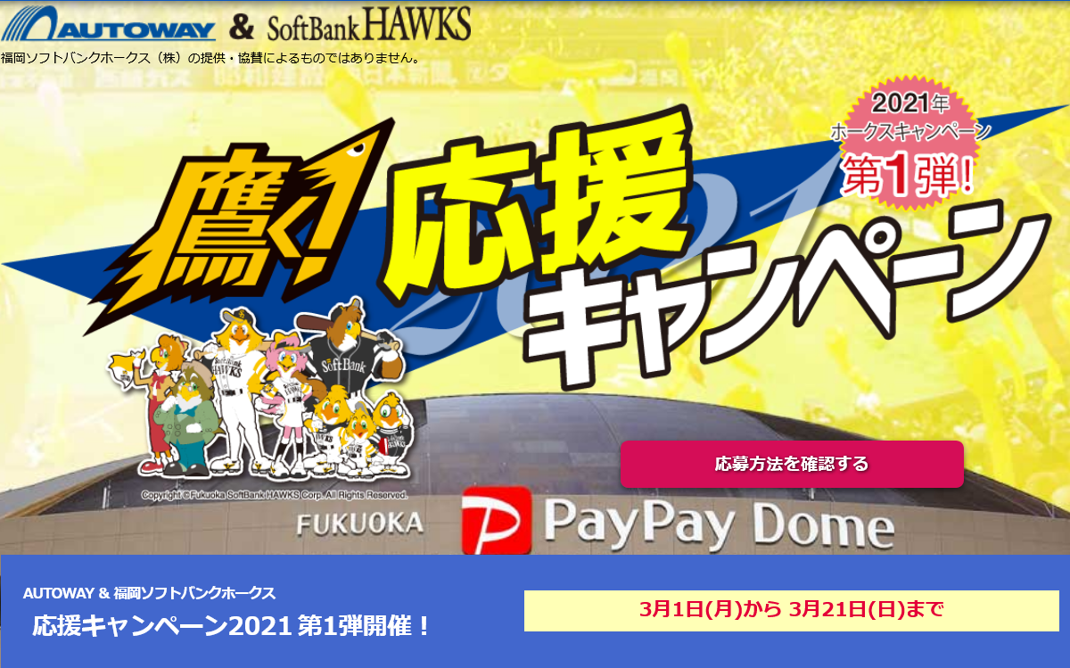 「オートウェイ&福岡ソフトバンクホークス 応援キャンペーン2021第1弾」が開催されています🎁