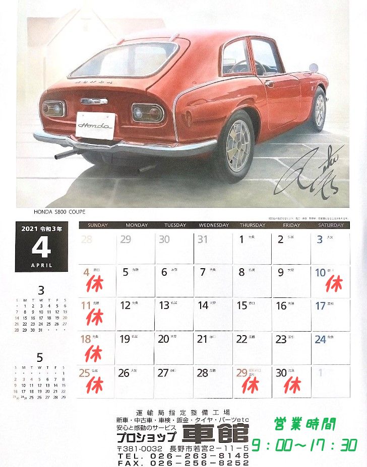 GW休業は4/29(木)~5/9(日)までお休みさせていただきますので、5月上旬に車検の満了日を迎えられる方はお早めにご予約ください。(車検は満了日の一ヶ月前より受けられます)