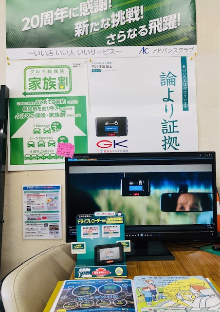 また、お客様にお待ちいただくスペースにパソコンを設置し、ドラレコ型保険の動画を流しています。