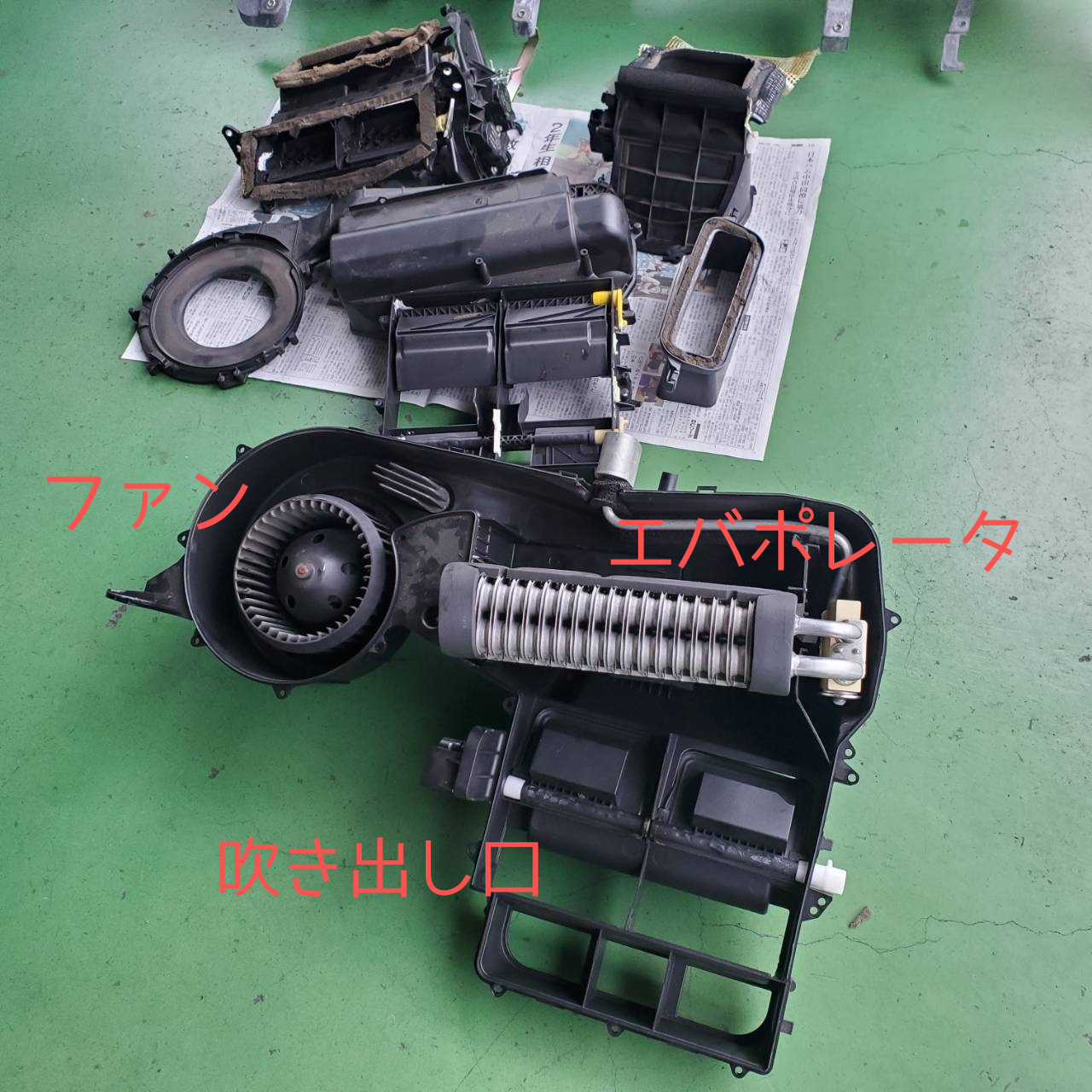 吹き出し口の横にあるエバポレータですが、こちらはエキスパンションバルブで冷たい霧にした後、この部品の網状の部分を通って車内に冷風を送る役割を持っています。