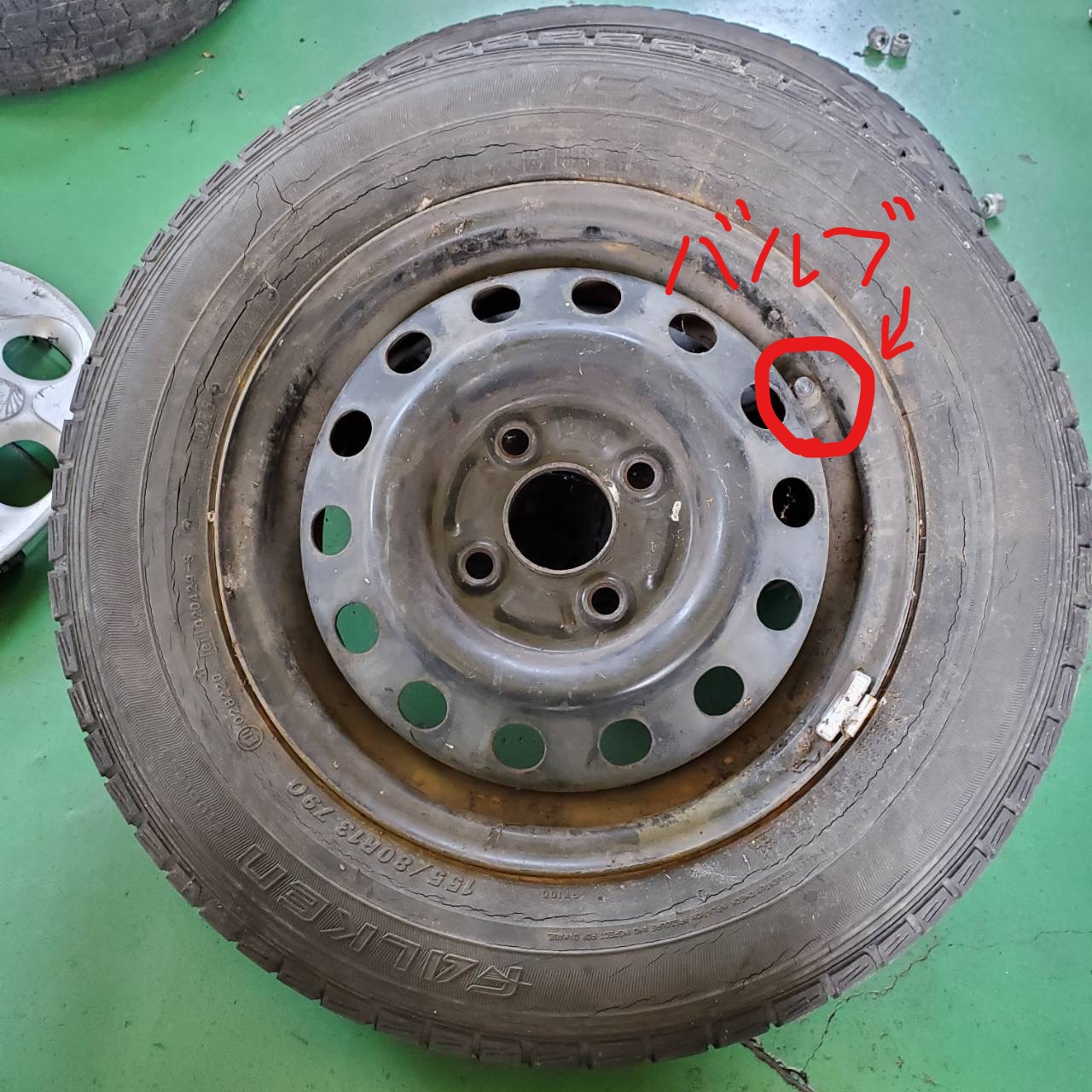 写真のタイヤのバルブは非常に劣化していて危険な状態でした。