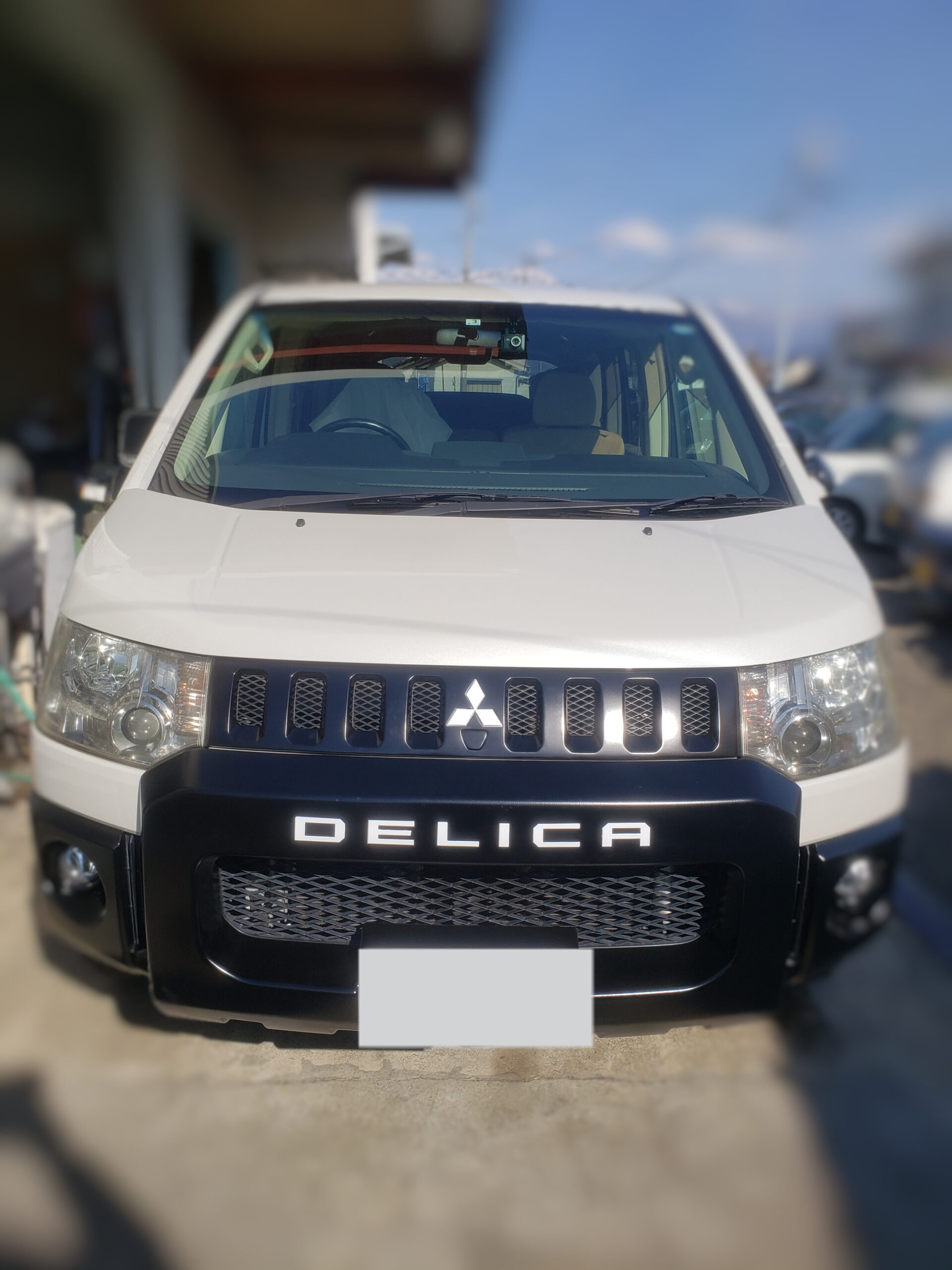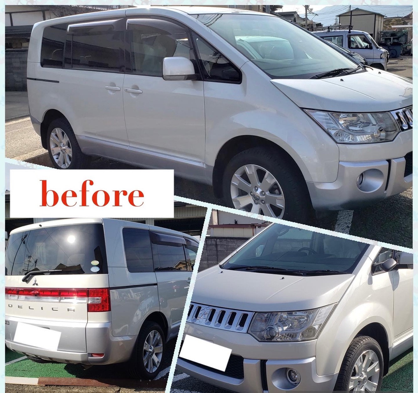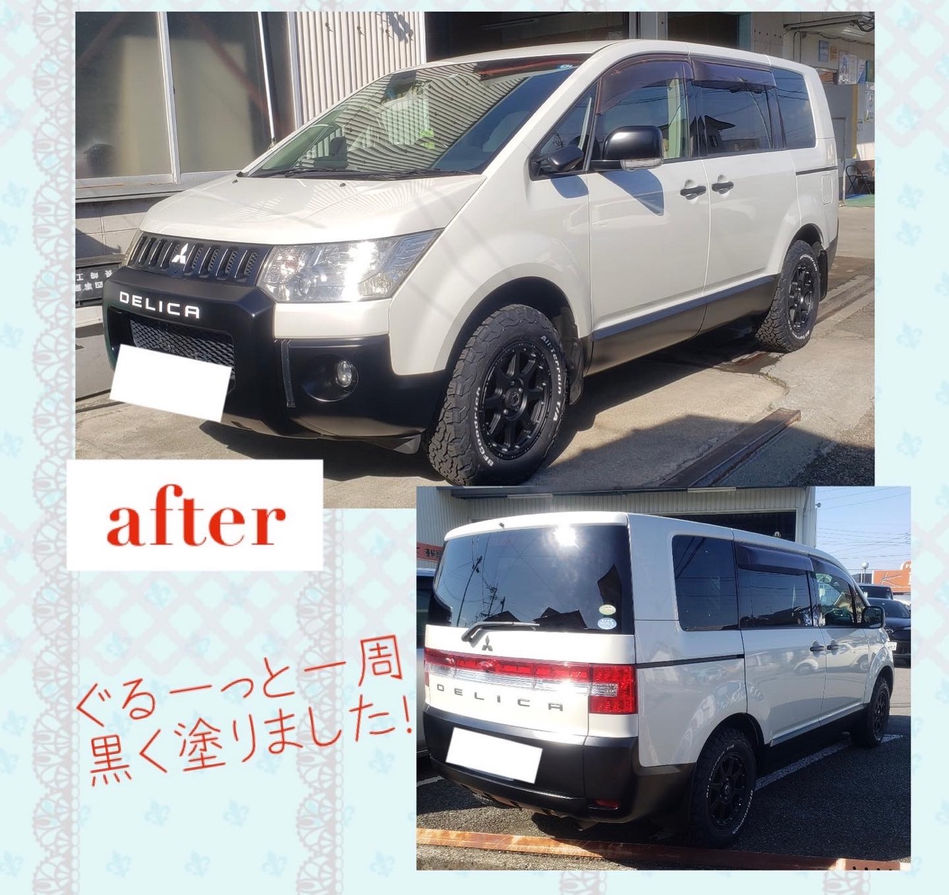 お客さまのご要望でフロントグリルやサイドガーニッシュ、リアバンパーなど下の部分をぐるーっと一周黒く塗装しました!