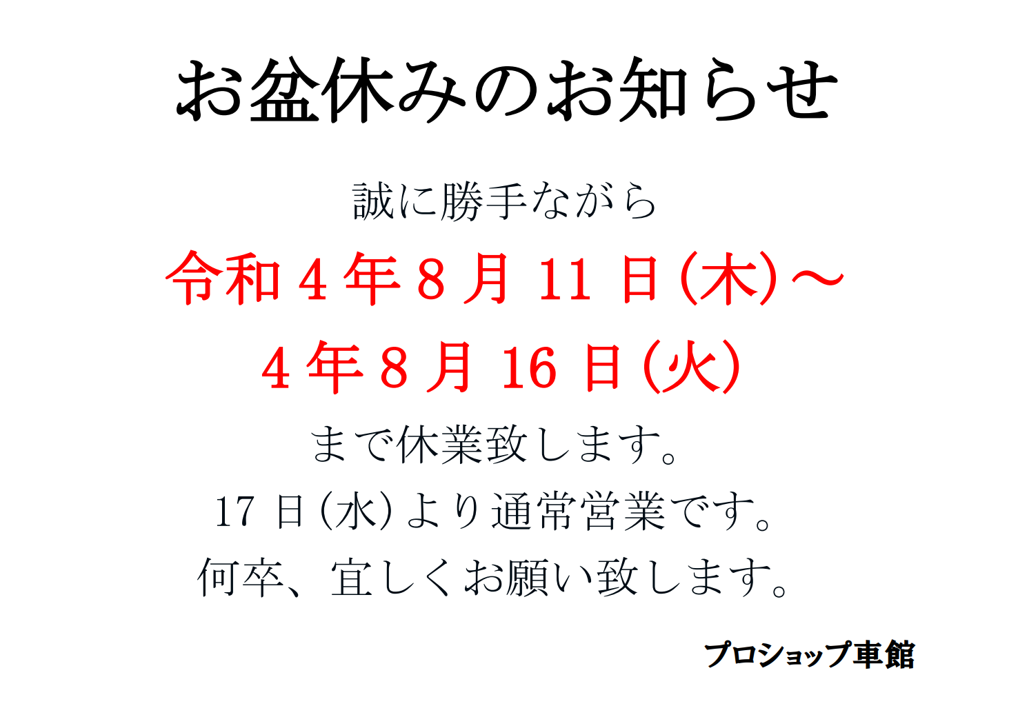 さて、お盆休みのお知らせをいたします。