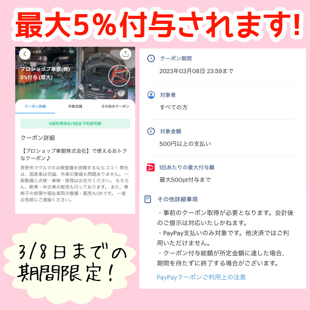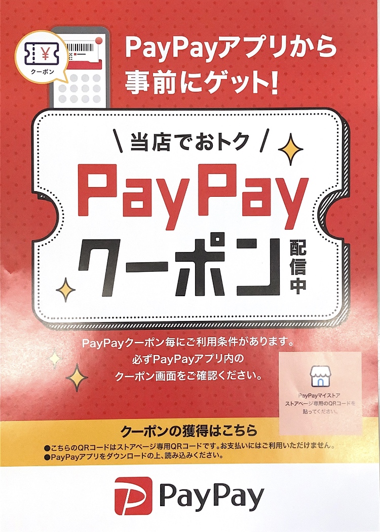 只今、当店で使える「PayPayクーポン」が配信中です!