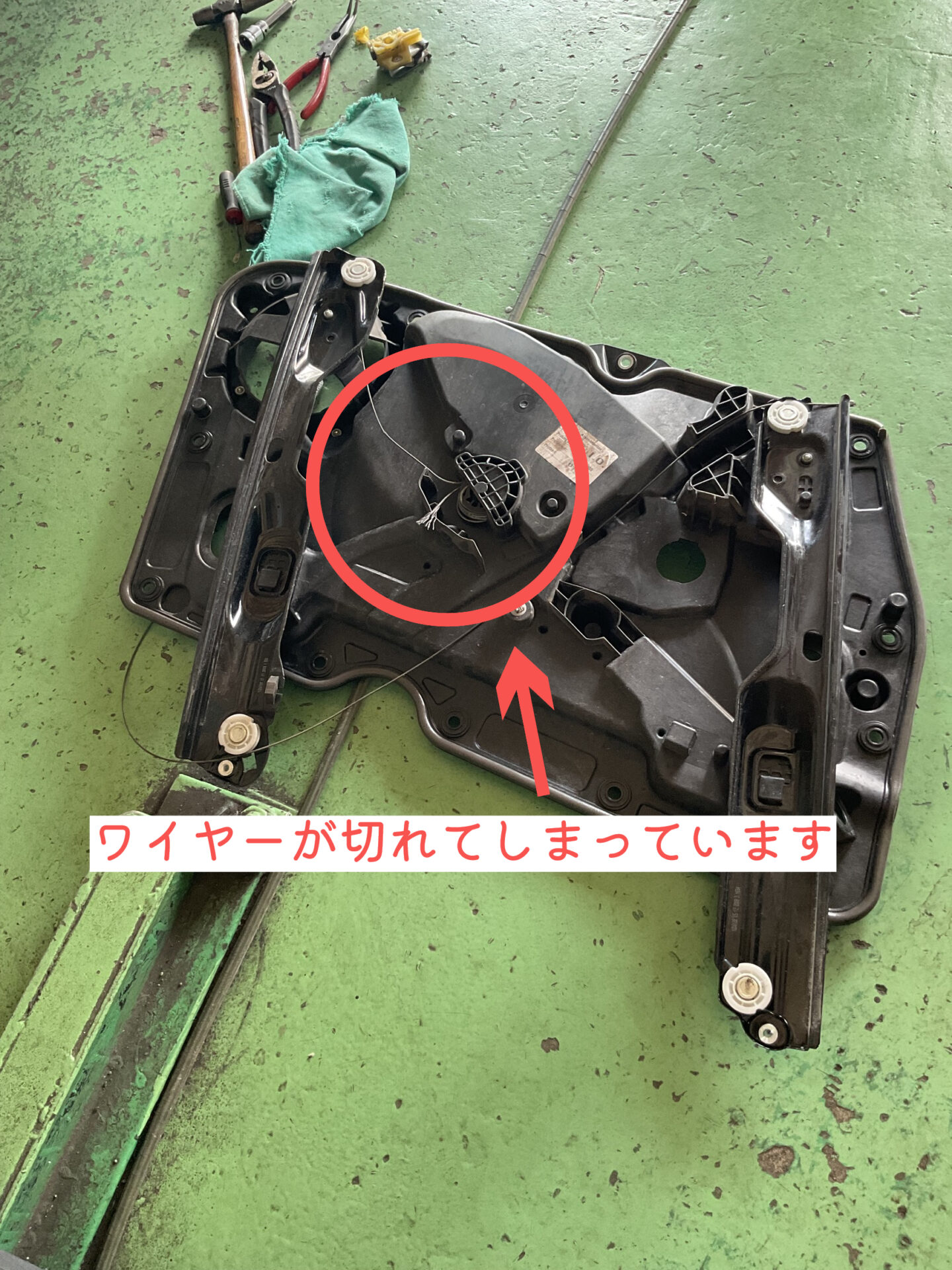 パワーウインドウレギュレーター(窓ガラスの開閉を自動でおこなってくれる開閉の調整装置)のワイヤー部分が切れていました。