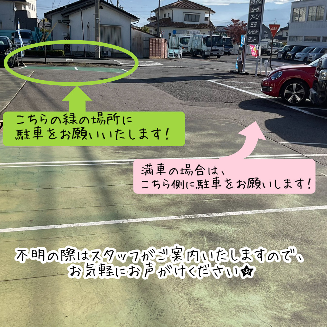 満車になることもしばしばございますので、ご不明の際はお気軽にスタッフにお声掛けください。