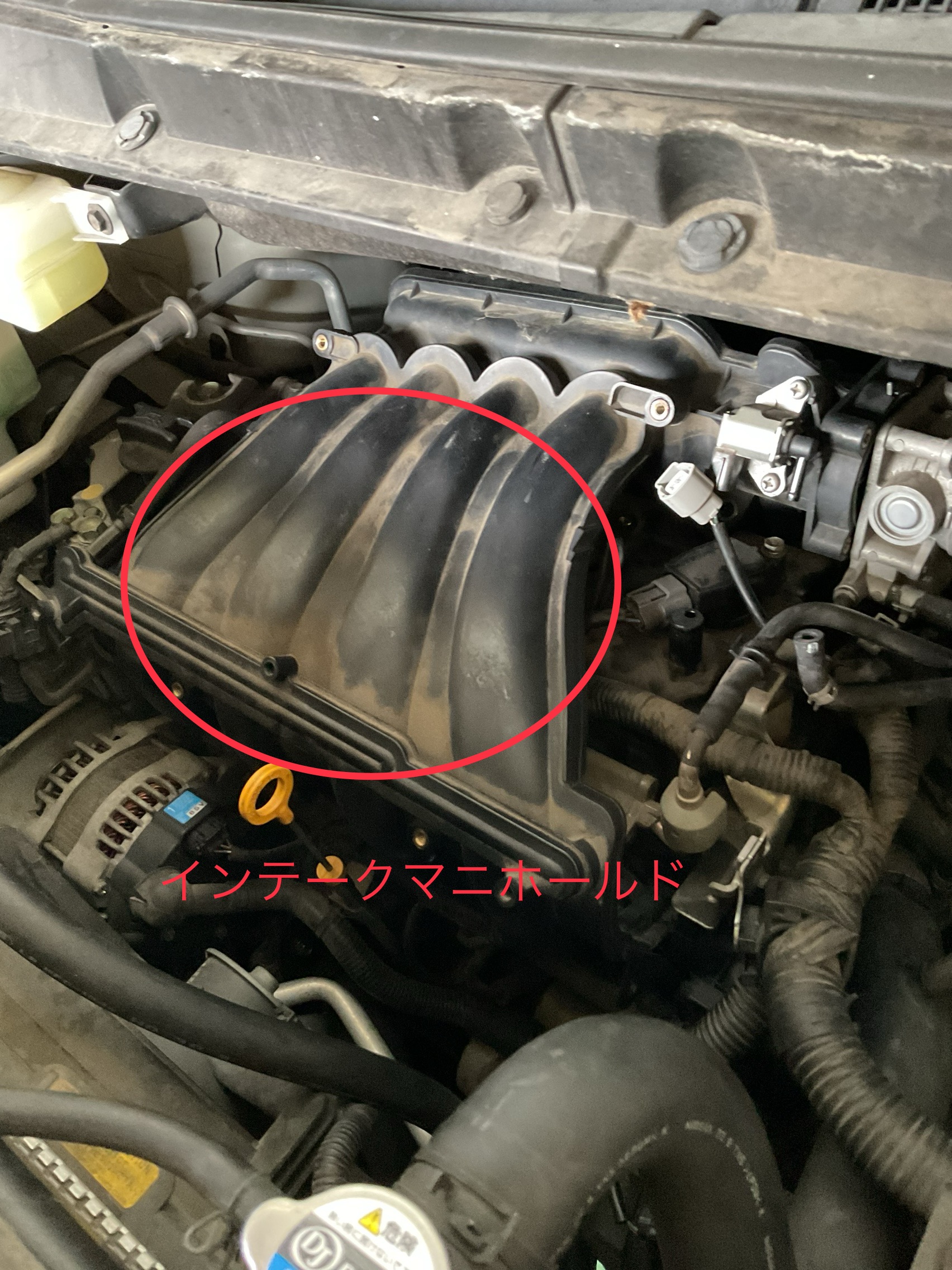 このセレナのMR20エンジンは、インテークマニホールドの下に配置されいるので、この部品をそっくり外さないとイグニッションコイルの交換ができません😮↓↓(赤い丸印部分)