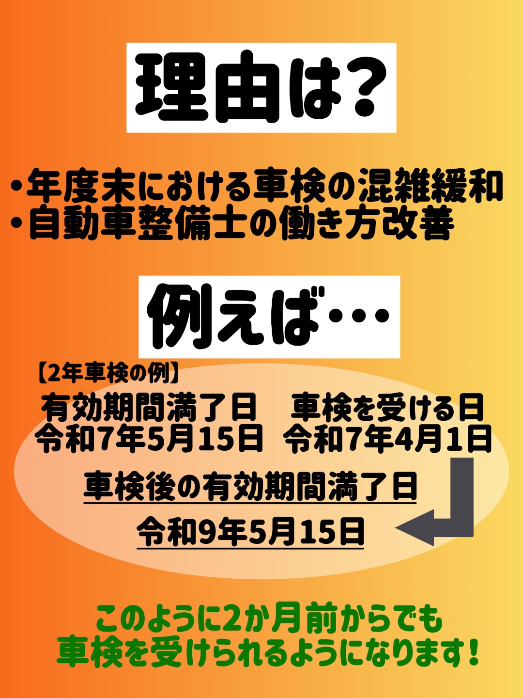 4月からは2か月前から車検を承れますので、予定が取りやすくなるなどお客様にもメリットがあるかと思います!