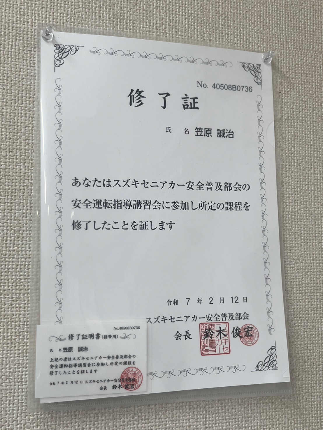スズキセニアカー安全普及部会の修了証をいただきました。