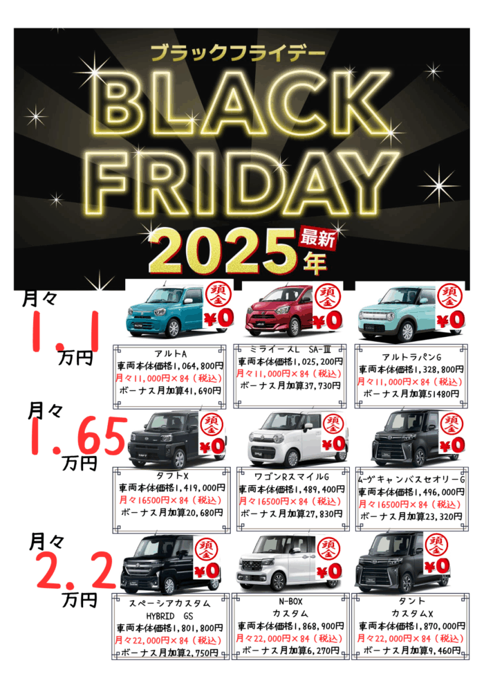 BLACK FRIDAY!! 「明日からブラックフライデー開幕」 11月1日からブラックフライデーが始まります! 日頃の感謝の気持ちを込めて大セールを行います🙌 なんと、明日から11月31日までファミリーマートのレジ上の大画面に広告を打ちました🙌 18時以降に流れますので機会がある方は1度立ち寄ってみてください! 車ももちろん、スタッドレスの季節も近づいてきました。 みなさんお早目のタイヤ交換を👍